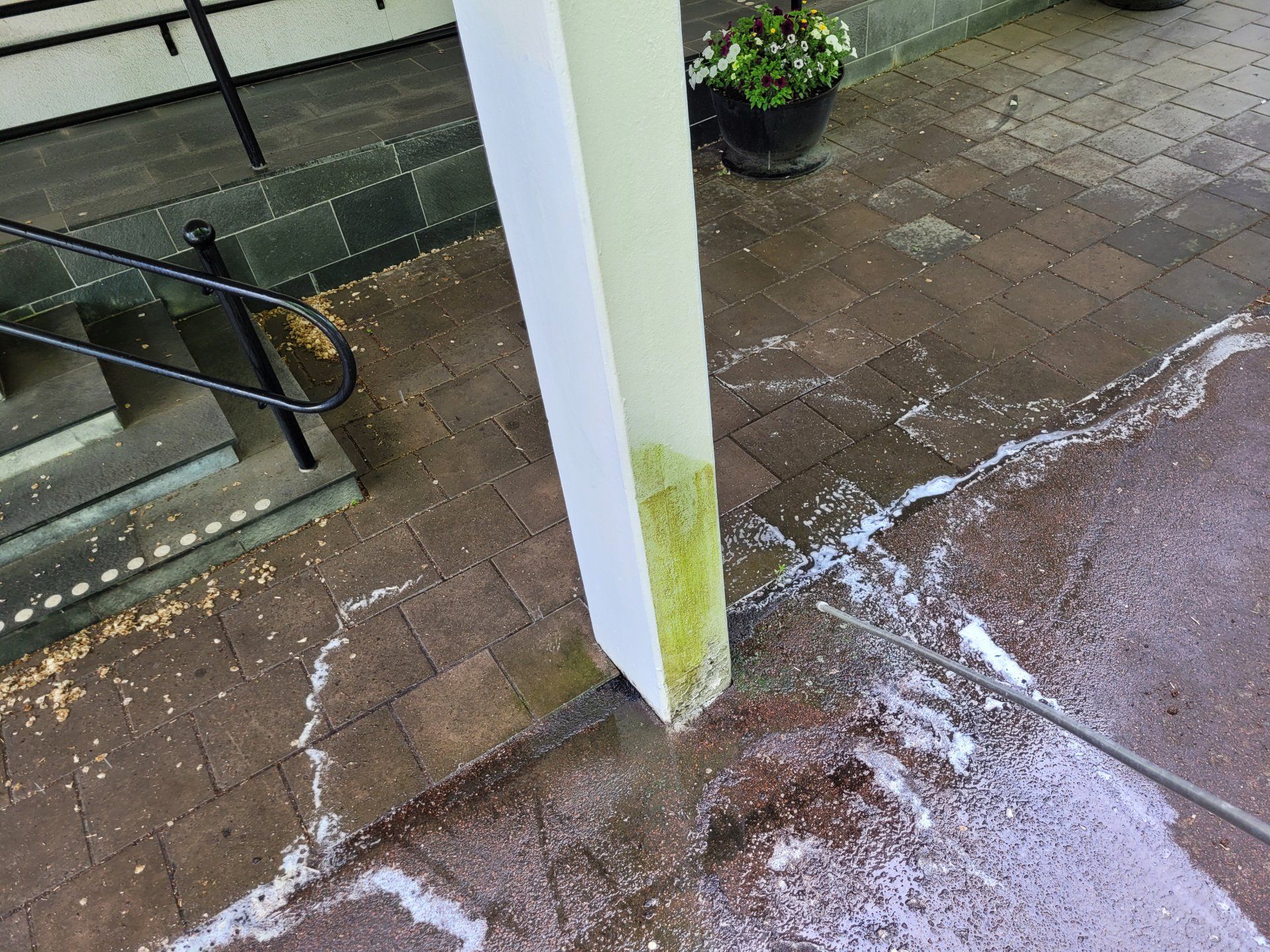Vår skonsamma fasadtvätt gör fasaden ren och fri från alger, ett perfekt underlag för ommålning
